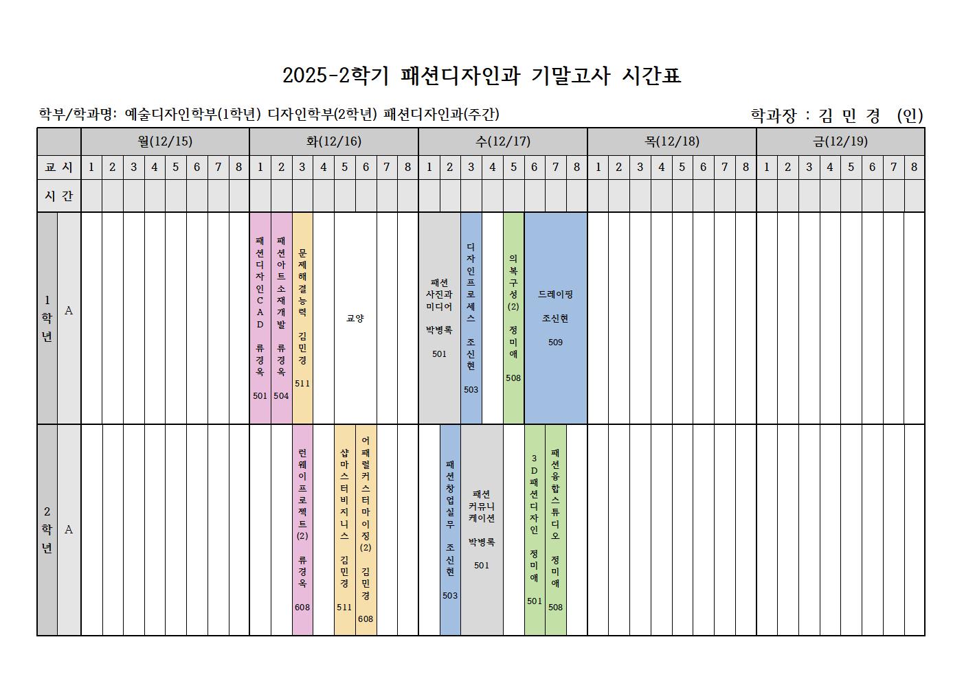 2025-2 [2025학년도 2학기 패션디자인과 기말고사 시간표]