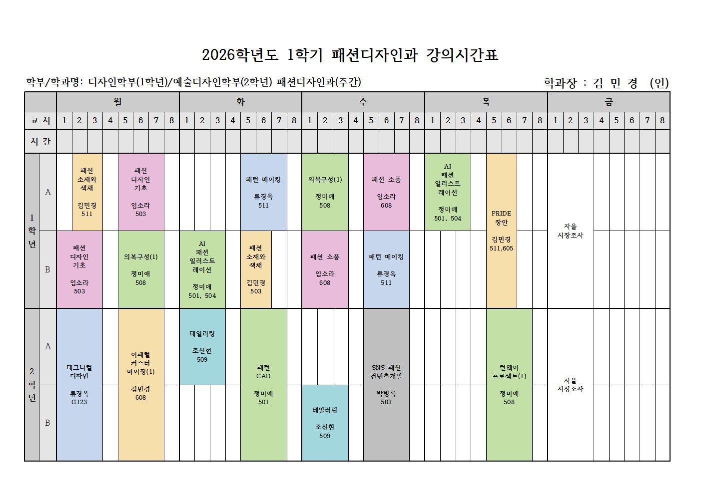 2026-1 [2026학년도 패션디자인과 1학기 시간표]